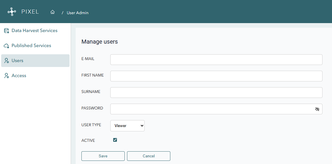 To add a new user, click on the "Add user" button in the user management interface. Fill in the required information for the new user, including their email address, first name and surname, password user type and if it is active. Once you have entered all the necessary information, click the "Save" button to create the new user.