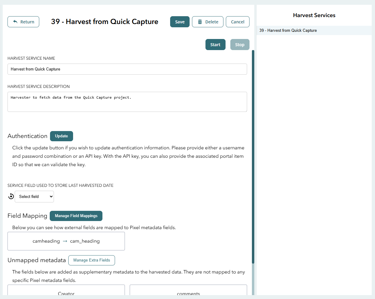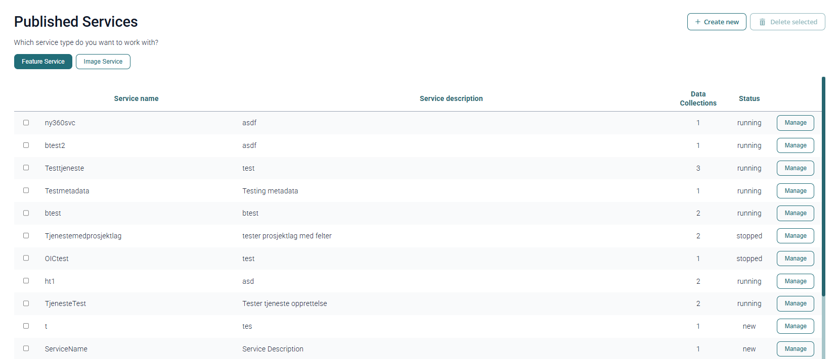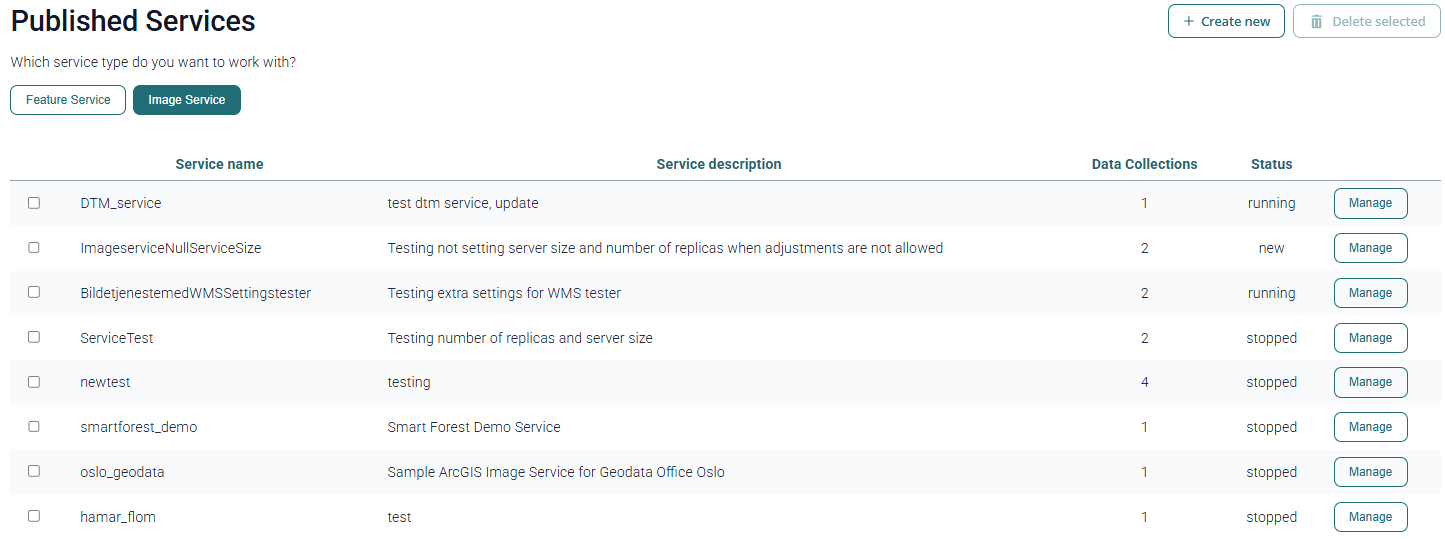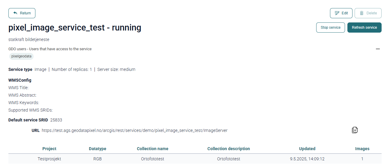 To manage an image service, press the manage button for the desired service. This page shows an overview of the service configuration and status. You can start, stop, delete or edit the service using the relevant buttons. The service address is displayed in the URL field. The table shows which data collections are included in the service.