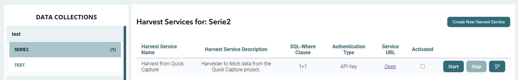 To open a data collection, you must first select a data collection from the project list. Next, press the open button from the dialog box in the left menu. You will now see the overview page for the data collection.