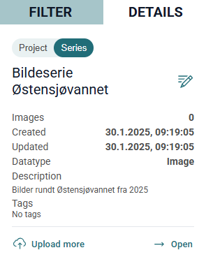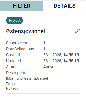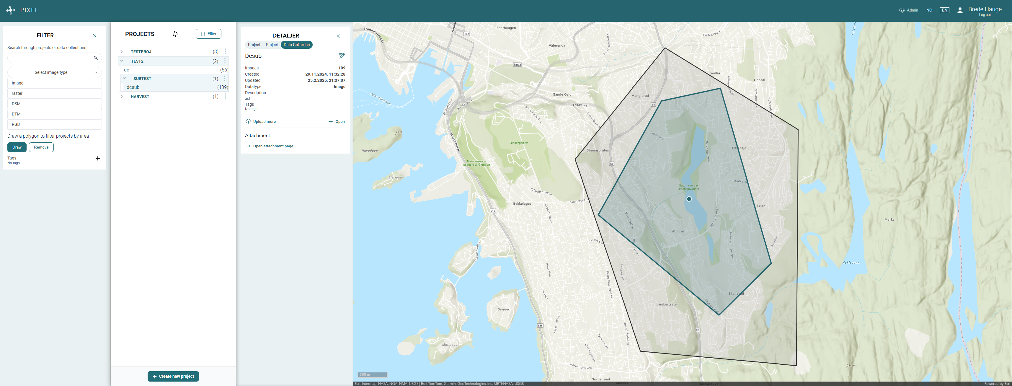 When you log in to the solution, you will be taken to a landing page with an overview of your own projects and projects that have been shared with you. An overview of the projects can be found in the right-hand menu in the project list. In the left menu, you will see details of the project or data collection that is selected. You can also filter content by using search or based on image type. The map view in the middle shows you an overview of all projects, or the polygon of the selected project or data collection.