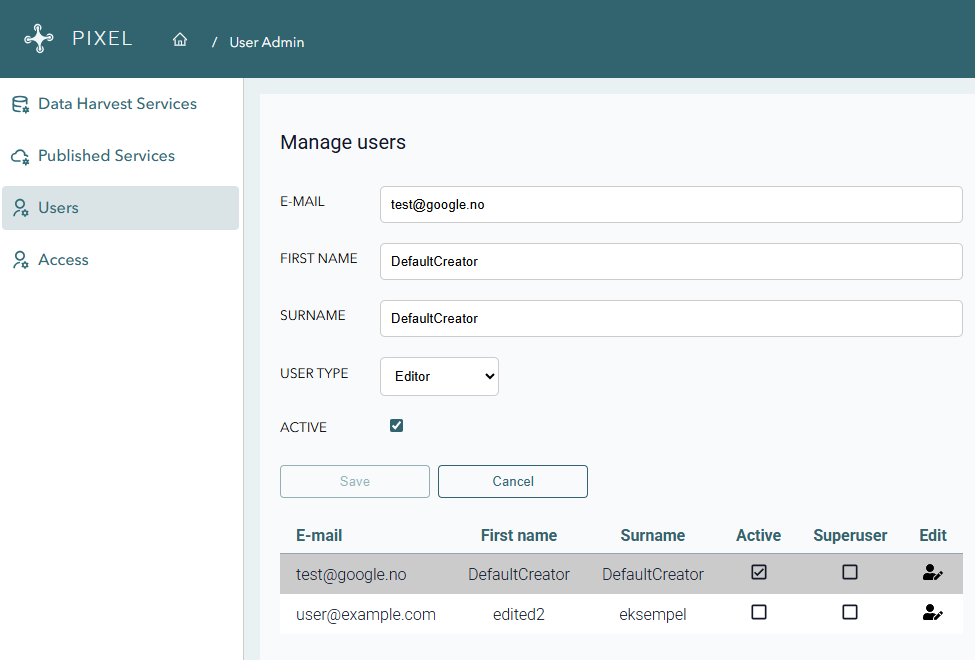 To edit an existing user, click on the "Edit" button indicated by a person with a pencil icon on the right side of the users table in the user management interface. You can change the user's email address, first name, surname, user type and if it is active. Once you have made the necessary changes, click the "Save" button to update the user's information.