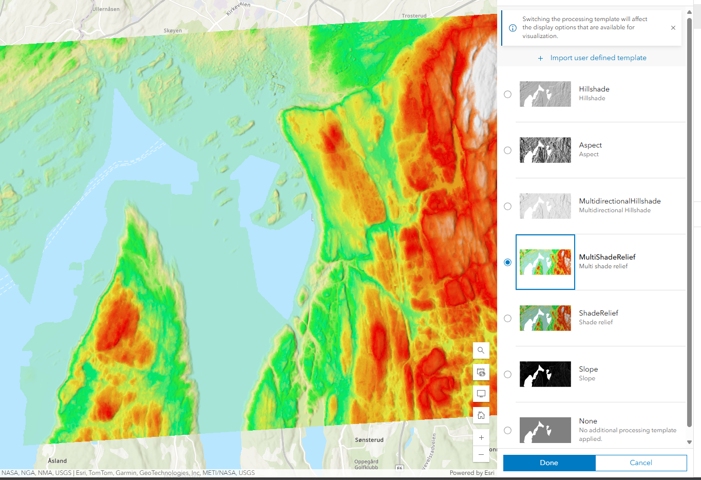 - Hillshade, Slope, Aspect, MultidirectionalHillshace, MultiShadeRelief, ShadeRelief (see illustration below)