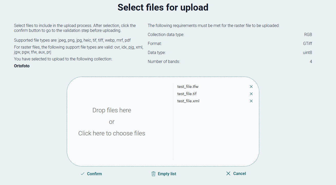 When you choose a raster data collection (Raster, RGB, DTM or DSM), you will be asked to select or define some additional settings or rules for the raster data collection. These rules exists to ensure some consistency in the raster data that is uploaded to the data collection. The rules are as follows: